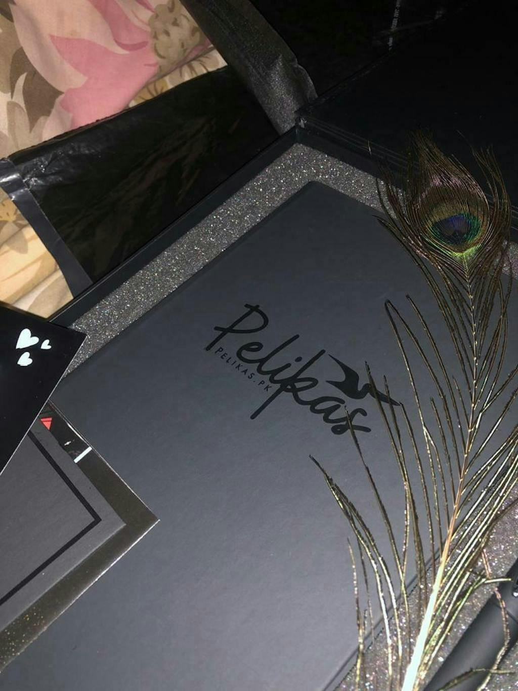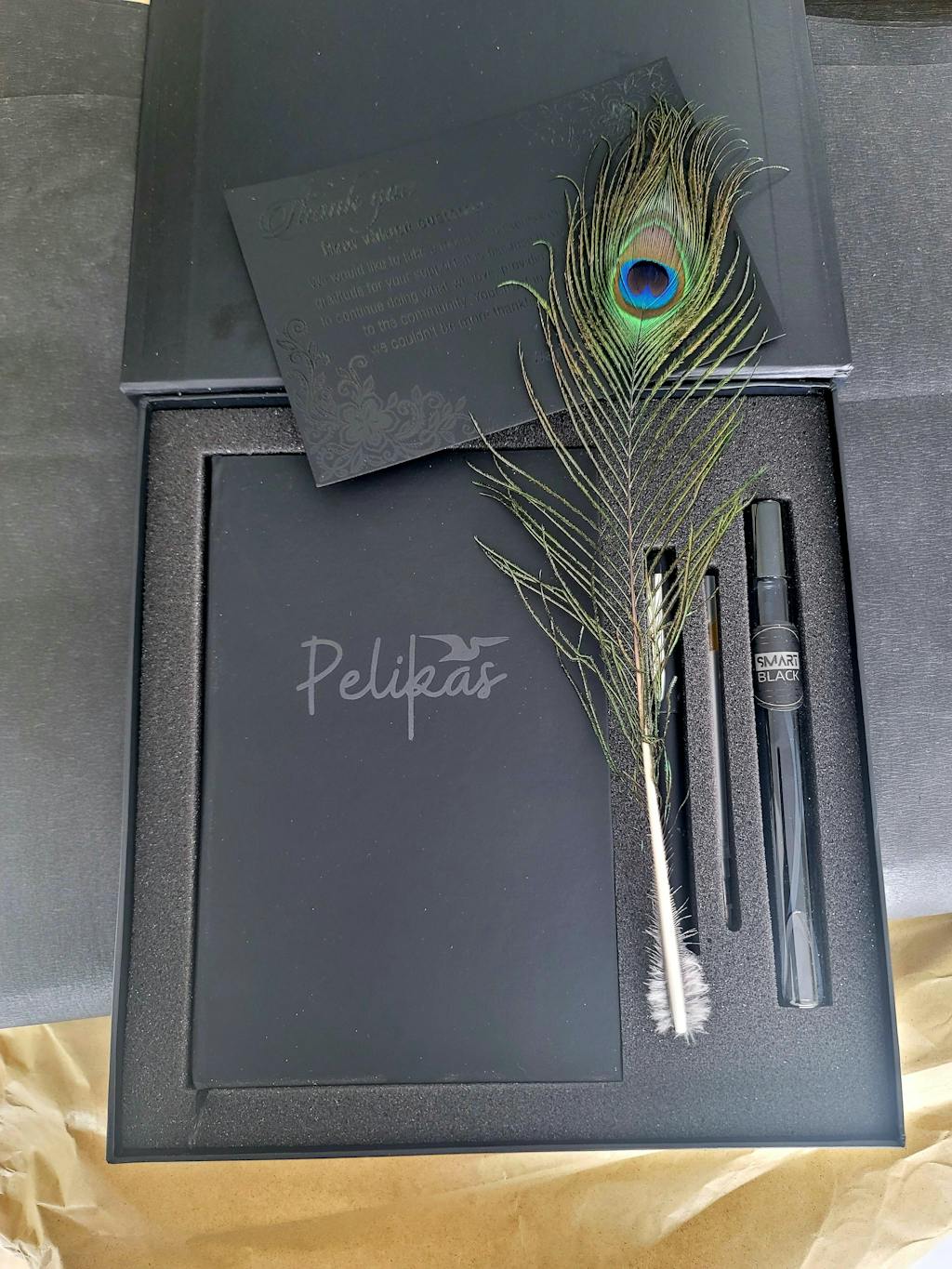 The high-quality notebook features black pages, making it perfect for writing with white or bright gel pens. The silver gel pen included in the gift box is the perfect complement to the notebook. The smart black luxury perfume is a sophisticated and elegant scent that is sure to please the recipient. The peacock feather adds a touch of luxury and elegance to the gift box.